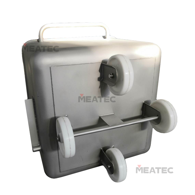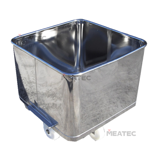 the buggy is made of high-quality 304 stainless steel, with a barrel body thickness of 2mm, a bottom thickness of 2mm plus an additional 3mm reinforcing plate. The barrel mouth features a curled edge, lifting lugs are equipped on the side, and four D160 nylon wheels are installed at the bottom.